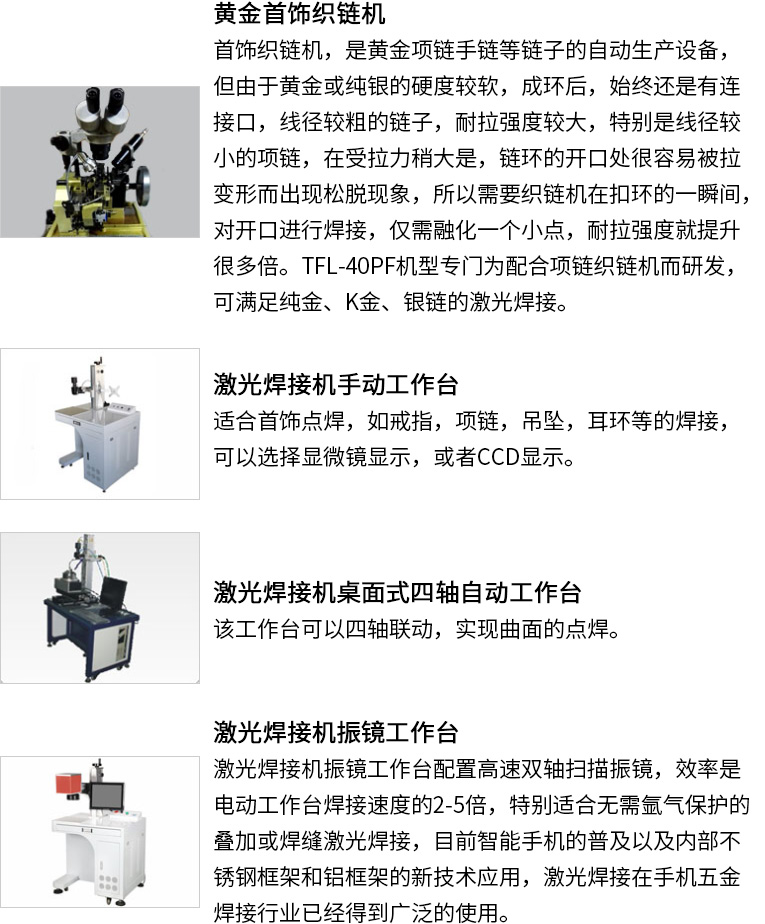 通發(fā)激光研發(fā)針配合黃金織鏈機(jī)、K金制鏈機(jī)、首飾制鏈機(jī)的TFL-80PF自動(dòng)激光焊接機(jī),焊接機(jī)采用能量反饋技術(shù),光點(diǎn)穩(wěn)定,能量強(qiáng)勁,實(shí)現(xiàn)一環(huán)一焊的功能,確保金鏈的耐拉強(qiáng)度。本激光焊機(jī)實(shí)現(xiàn)了水冷一體的小型化結(jié)構(gòu)。適用于各種生產(chǎn)場所。