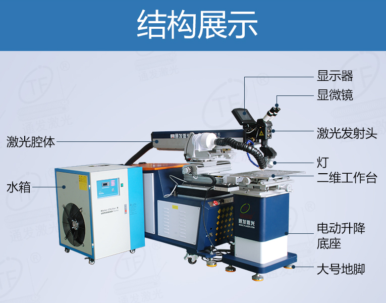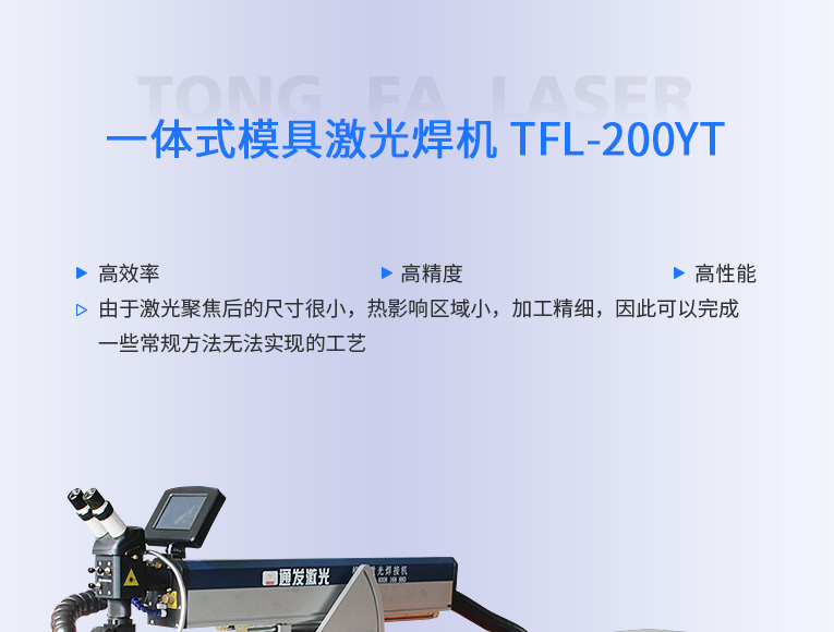 通發(fā)激光一體式模具激光焊機TFL-200YT/TFL-400YT是一款多種功能融合一體的新型模具激光焊接機,針對特大型塑料模具激光焊、中型注塑模具激光燒焊、小型塑膠模具激光補焊、壓鑄模激光補焊具等各類模具可實現(xiàn)超精密修復,幫您解決大型汽車模具修復難題,不需要模具移動,電動工作臺與立體旋轉(zhuǎn)激光頭完美結(jié)合,操作桿控制運動移動實現(xiàn)輕松激光修復大型模具,同時也保留了傳統(tǒng)手動工作臺超精密修復模具功能。