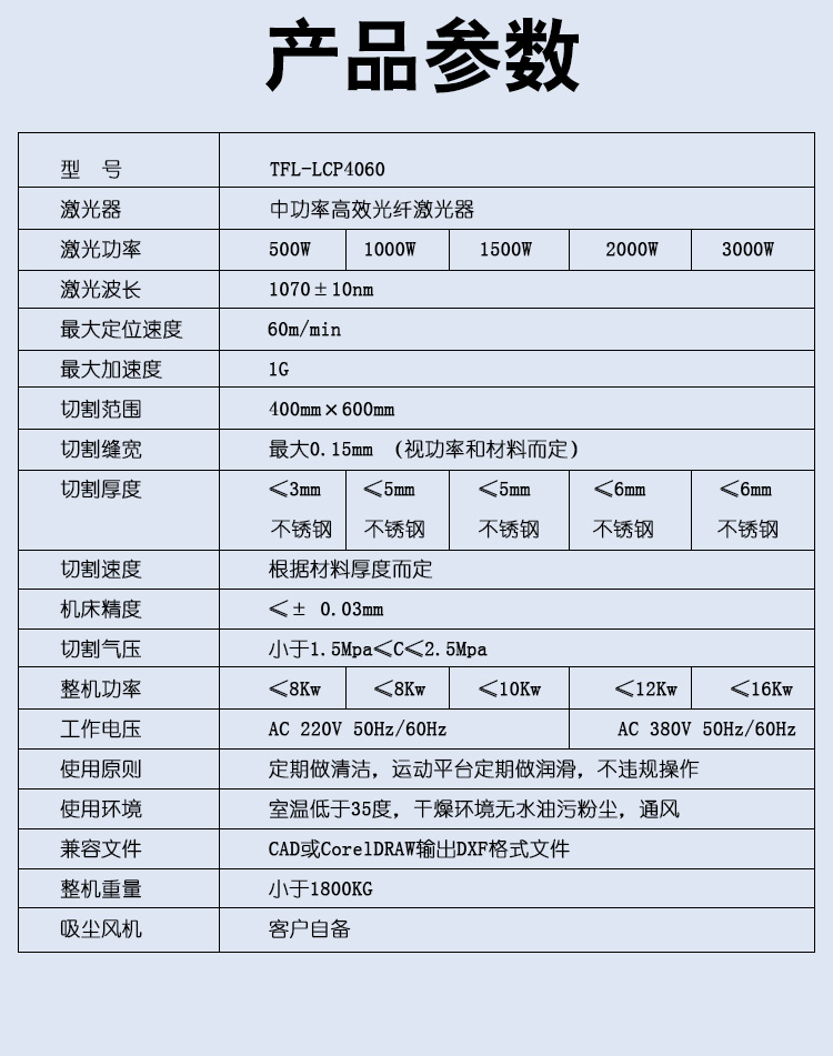 | 激光功率 | 500W | 1000W | 1500W | 2000W | 3000W |