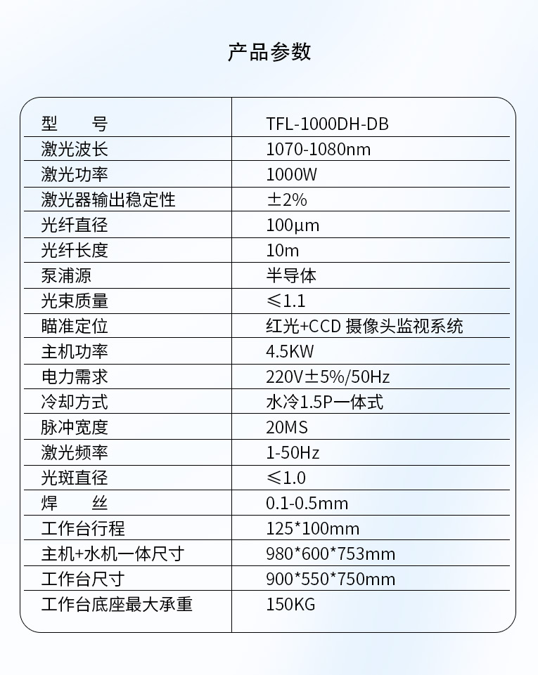采用光纖激光器,反射率高,能量強(qiáng),免維護(hù),免調(diào)光,功耗少,相比傳統(tǒng) 模具焊來(lái)說(shuō),體積小,安全,穩(wěn)定性好超長(zhǎng)使用壽命。 1000W光纖激光器,滿足銅、鋁焊接量大的模具及產(chǎn)品焊接加工需要。 高承重底座及工作臺(tái),保持輕便靈活的優(yōu)點(diǎn),同時(shí)提供更高承載能力。 配備.1.5P大功率一體式水冷水機(jī),保證了大功率焊接的穩(wěn)定性。